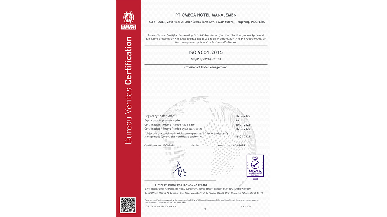 Omega Hotel Management, as part of the ALFALAND GROUP, is proud to be officially certified with ISO 9001:2015 by Bureau Veritas a globally recognized standard for quality management systems.