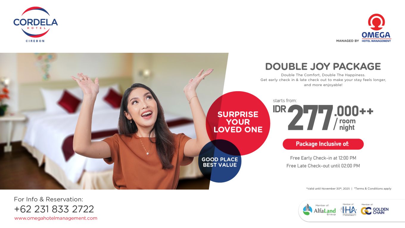 Click Here Experience Double the Comfort and Double the Happiness with the Double Joy Package at Cordela Hotel Cirebon. Make your reservation now and create lasting memories in one of Cirebon's most welcoming hotels.