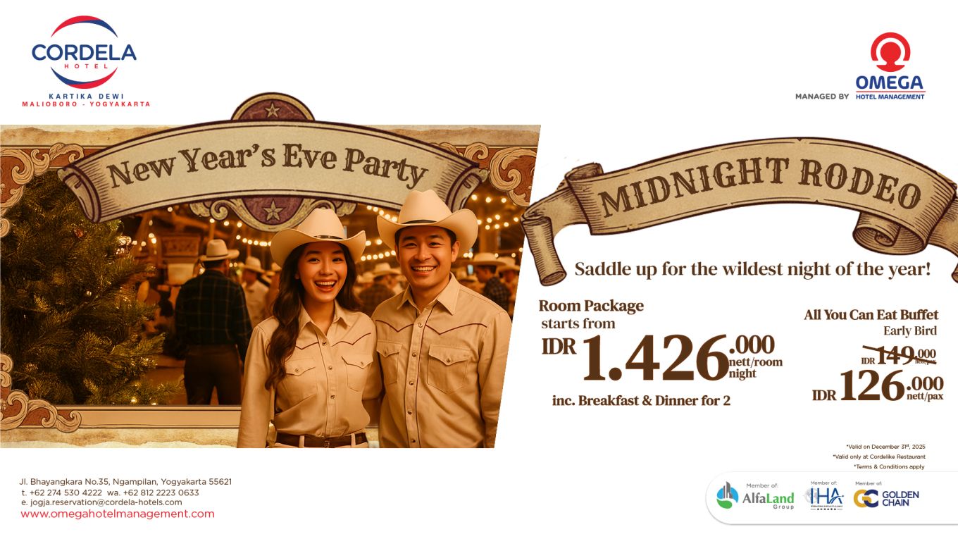 Cordela Hotel Kartika Dewi Yogyakarta invites travelers families and staycation lovers to welcome the New Year with an unforgettable celebration through our Midnight Rodeo New Years Eve Party. Managed by Omega Hotel Management this special room promo delivers the perfect blend of comfort festive excitement and culinary enjoyment for guests who love traveling and exploring the beauty of Yogyakarta.