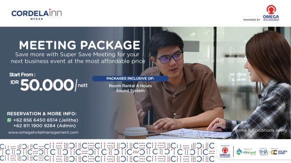 Host productive and professional business meetings with the affordable Meeting Package at Cordela Inn Medan. Starting from IDR 50.000 nett, this offer includes a comfortable meeting room, sound system, and convenient hotel facilities designed to support workshops, presentations, and corporate gatherings. Perfect for companies seeking a strategic location, quality service, and great value in Medan.