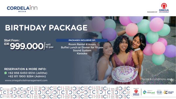 Celebrate unforgettable birthday moments with the Birthday Package at Cordela Inn Medan, starting from IDR 999.000 nett for 10 persons. Enjoy a private event space for four hours, delicious buffet lunch or dinner, complete sound system, and karaoke to keep the celebration lively. Perfect for families, friends, and intimate gatherings seeking a convenient venue, great food, and warm hospitality in Medan.