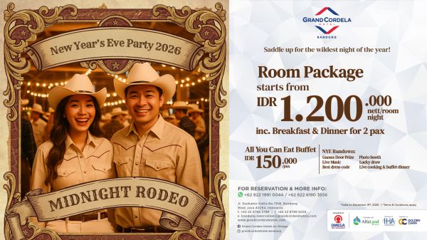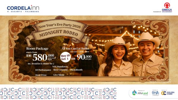 Celebrate New Years Eve at Cordela Inn Palembang with the Midnight Rodeo room package starting from IDR 580.000 per night including breakfast and dinner for two Enjoy an All You Can Eat buffet from IDR 90.000/person DJ performance live music photo booth best costume and door prizes for a fun and affordable New Year celebration in Palembang.