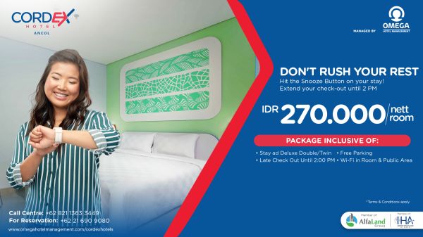 Enjoy a relaxing escape with the Don't Rush Your Rest Promo at Cordex Hotel Ancol, managed by Omega Hotel Management. Stay from only IDR 270,000 nett per night in a comfortable Deluxe Room. Enjoy free Wi-Fi, parking, and a late checkout until 2 PM. Perfect for staycations, business trips, or weekend getaways near Ancol Dreamland in North Jakarta.