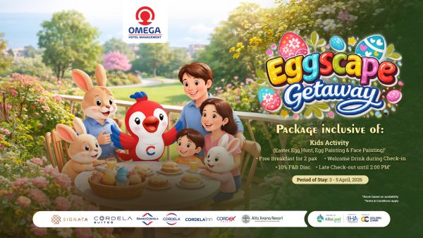 Enjoy Eggscape Getaway 2026 Easter staycation promo at Omega Hotel Management with kids activities, free breakfast for two, F and B discount, welcome drink, and late check out. Available across Cordela Suites, Grand Cordela, Cordela, Cordela Inn, Cordex, and Alfa Jivana Resort.