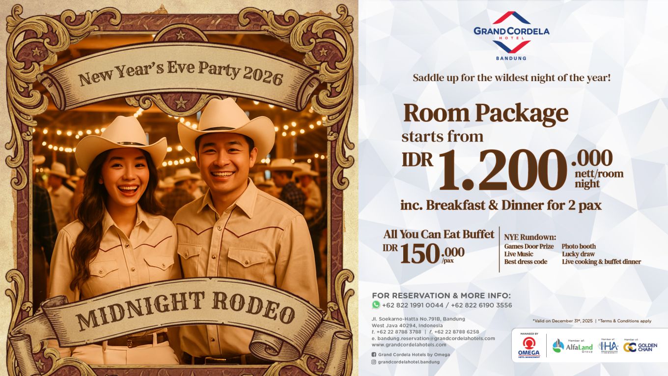Grand Cordela Hotel Bandung invites travelers families and staycation lovers to celebrate the New Year with a special Midnight Rodeo themed room package. Managed by Omega Hotel Management this New Years Eve promo brings a perfect combination of comfort delicious dining and festive entertainment for guests who want to enjoy an unforgettable holiday moment in Bandung.