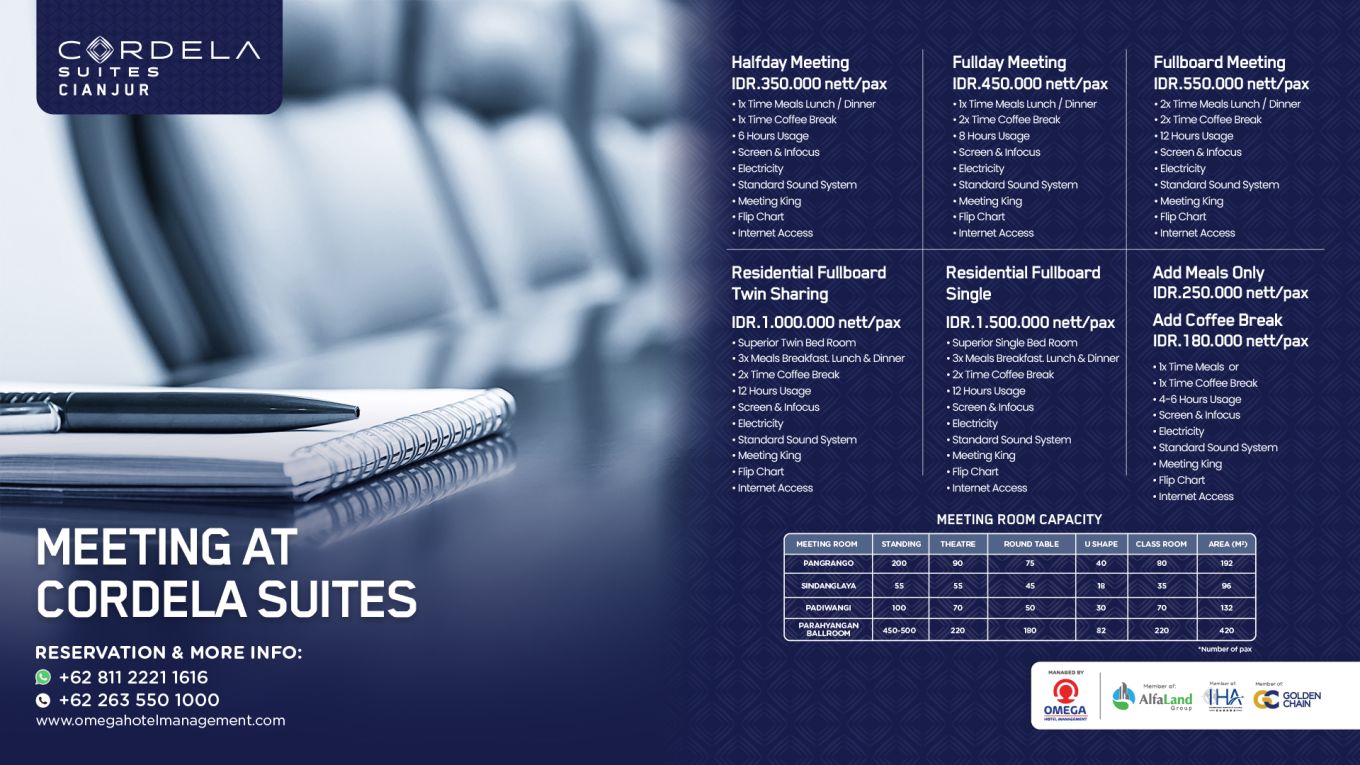 Cordela Suites Cianjur understands that every meeting must run effortlessly. That is why the Halfday Meeting package provides exceptional value for short sessions or corporate gatherings that require focus and efficiency. This package includes one time meals for lunch or dinner one time coffee break six hours of room usage full access to screen and infocus projector electricity a standard sound system a meeting kit a flip chart and internet access. Designed for convenience the Halfday Meeting package ensures guests can enjoy productive discussions supported by reliable facilities and professional service.