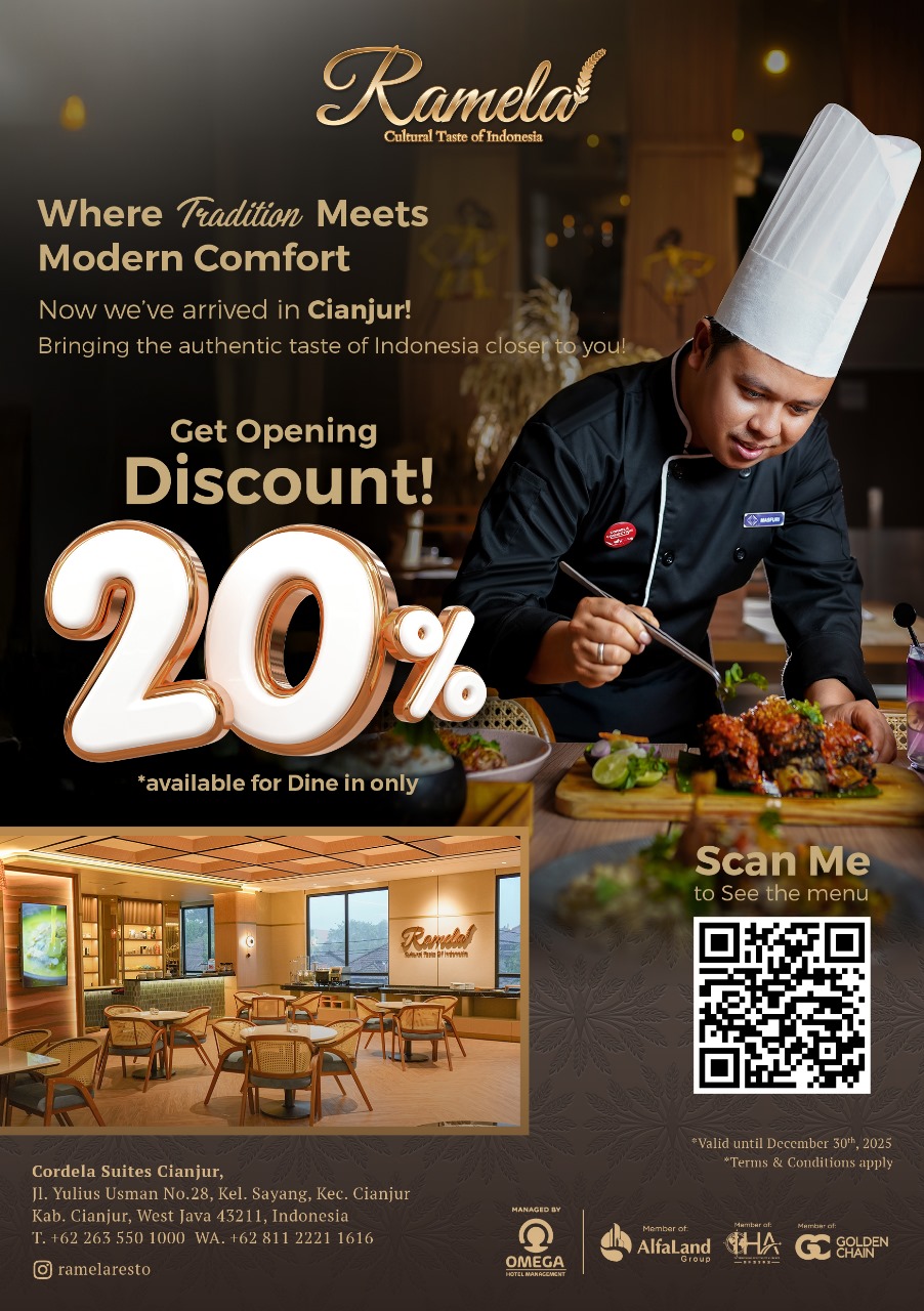 If you are searching for a memorable culinary experience during your staycation or weekend getaway in Cianjur, Ramela Resto Cianjur is ready to welcome you with an exclusive Grand Opening promotion that brings together tradition, comfort, and the warm hospitality that Omega Hotel Management is known for. Located inside Cordela Suites Cianjur, Ramela Resto is designed to give guests a delightful dining atmosphere where authentic Indonesian flavors meet a stylish and modern dining space.